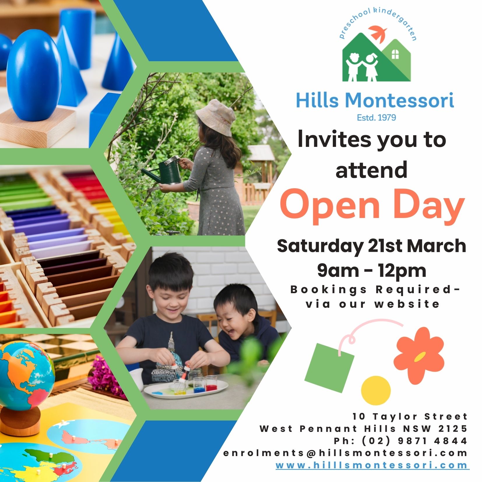 Hills Montessori we like to invite families to attend our annual Open Day on Saturday 21st March 2026. Families will be able to explore the classrooms, speak to the educators, admin staff as well as parents of current children. At Hills Montessori we create life-long learners by providing guidance and an environment that encourages children to be self-motivated, independent, and resilient. We recognise that every child is unique and help each child learn and develop at their own pace, through their own experience, and by following their interests. Most importantly, we help a child discover who they are and nurture what they love to do. Bookings Required – Book Now!