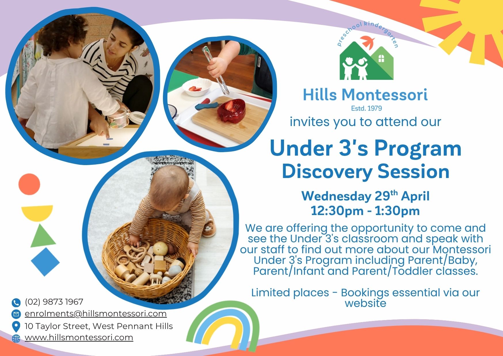 Families are invited to explore our nurturing Montessori environment for children under three. This one‑hour session offers a chance to step inside our Parent/Baby, Parent/Infant and Parent/Toddler classroom, meet our educators, and learn how Montessori supports independence, connection and calm, purposeful learning from the very beginning.